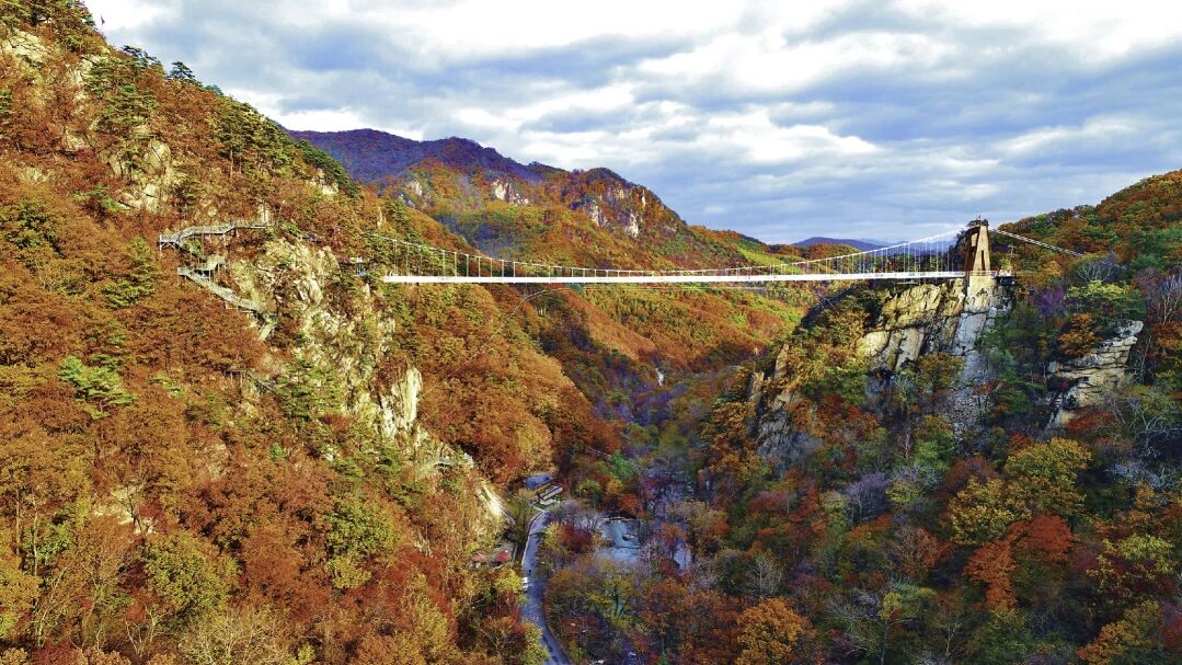 沿着国庆刚开通的本桓宽高速,到达丹东天桥沟景区,漫步木栈道上,穿越“中国枫叶最艳最红”的山谷,随手一拍都是流动的“油画”。